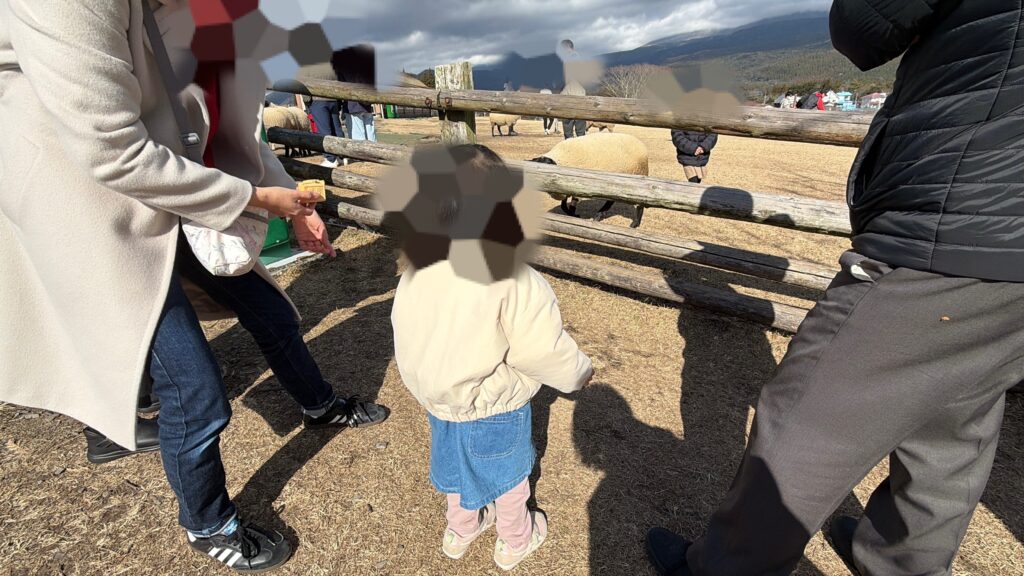楽しみにしていた餌やりですが、いざ近くに行くとヤギの迫力に圧倒されてしまい……。私と3歳の娘は怖くて、柵の外からそっと見学しました(笑)。