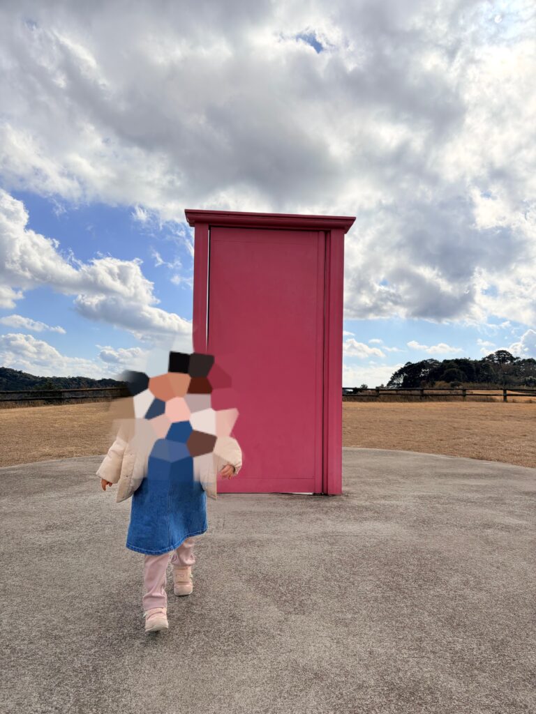 牧場内の急な坂を頑張って登ると、なんと「どこでもドア」が出現!子供たちも大喜びで、最高のフォトスポットでした。